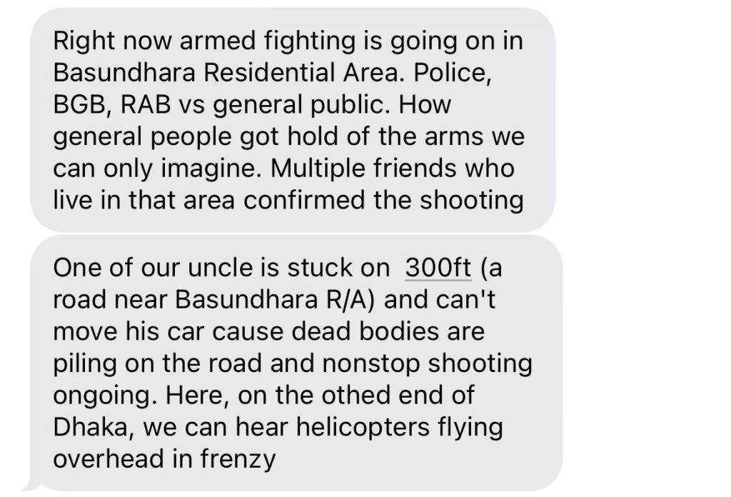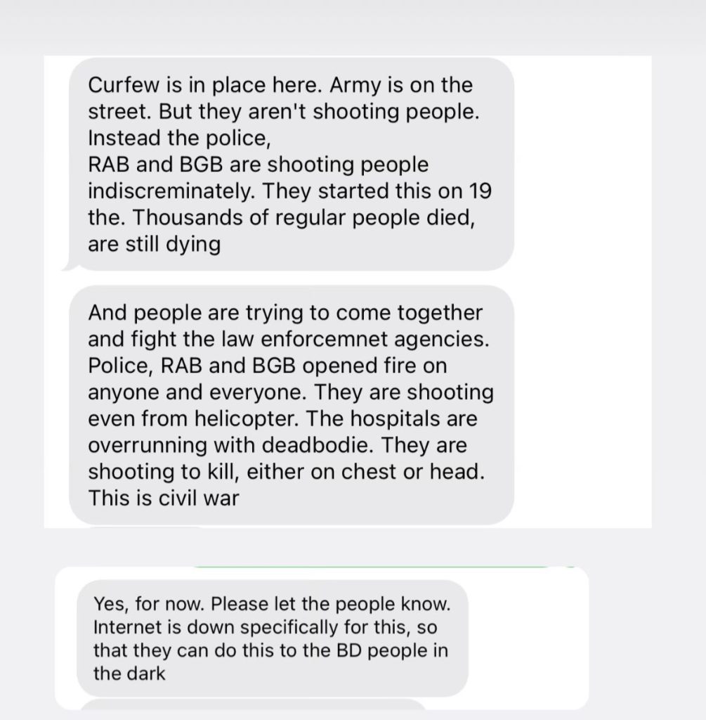 According to recent updates from our sources, friends, and families in Dhaka, we’ve learned that with the rising death toll and curfews imposed, authorities have issued shoot-on-sight orders.